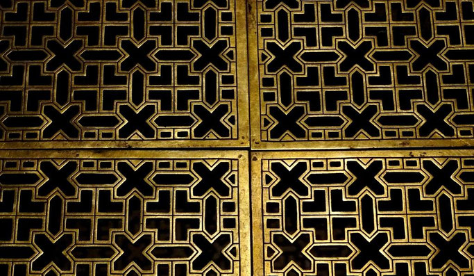 Manchmal ist der Blick nach unten auch ein Aha-Erlebnis. Das Foto zeigt ein Bodengitter in goldener Farbe mit verschiedensten Kreuzdarstellungen. Dieses Gitter befindet sich in einer Kirche.
